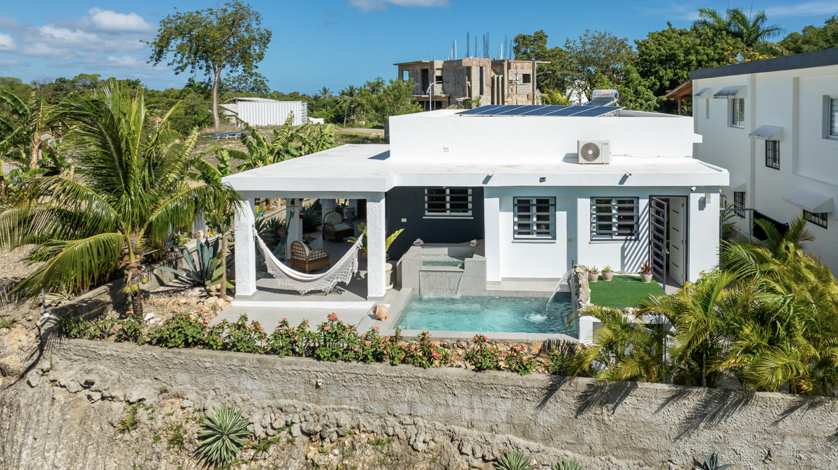 Welcome to your new oasis in the picturesque hills of Sosua! Discover this stunning, newly built home that offers the perfect blend of modern elegance and natural beauty. With 2 bedrooms and 2 bathrooms, a half bathroom for visitors and another half bath in the laundry room this property is an ideal sanctuary for families and individuals seeking comfort and tranquility. The garage area can easily be converted to a 3rd bedroom.