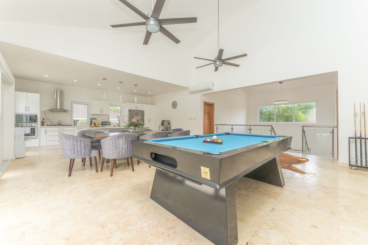 A striking square staircase with stainless steel, glass panels, and oak steps connects the levels, leading to an expansive entertainment area. The open-concept kitchen, dining area, and living room with pool table open directly onto a large pool deck, creating a perfect space for entertaining or unwinding in the tropical sun.